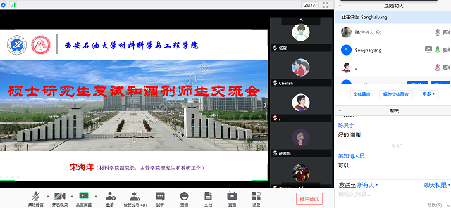 為幫助學(xué)院上了國(guó)家分?jǐn)?shù)線的考研學(xué)生更加充分地做好復(fù)試和調(diào)劑工作,5月4日下午,材料科學(xué)與工程學(xué)院通過騰訊會(huì)議平臺(tái)舉辦考研學(xué)生復(fù)試和調(diào)劑在線師生交流會(huì)。本次報(bào)告會(huì)由學(xué)院分管研究生工作的副院長(zhǎng)宋海洋擔(dān)任主講,50余名學(xué)生參加了本次線上學(xué)習(xí)討論。報(bào)告會(huì)由輔導(dǎo)員宋二鵬老師主持。
