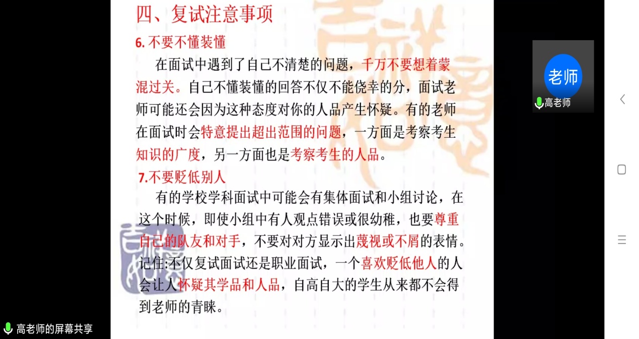 會上,高院長從復(fù)試的資格、復(fù)試的內(nèi)容和流程、復(fù)試能力要求、復(fù)試注意事項、如何準(zhǔn)備復(fù)試、考研調(diào)劑6個方面介紹了近幾年考研復(fù)試和調(diào)劑的政策、流程、變化趨勢和注意事項,提醒同學(xué)們注意調(diào)劑系統(tǒng)開放的時間、隨時關(guān)注研招網(wǎng)通知、注意與目標(biāo)意向?qū)煴3致?lián)系。高院長對同學(xué)們提出了三點建議,一是抓住機(jī)會,充分利用研究生擴(kuò)招等國家利好政策,認(rèn)真準(zhǔn)備復(fù)試或調(diào)劑;二是持續(xù)關(guān)注,積極備戰(zhàn),利用一切可以利用的資源和力量,與學(xué)院專任教師和輔導(dǎo)員保持聯(lián)系,暢通信息獲取渠道;三是調(diào)整心態(tài),保持樂觀態(tài)度,不因疫情而停滯或打亂自己的人生規(guī)劃。