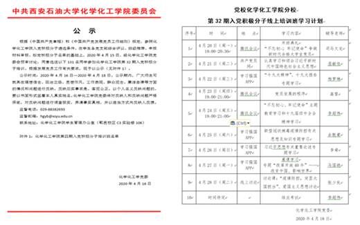 本次培訓(xùn)是化學化工學院黨校第一次開展在線培訓(xùn),為了做好此項工作,化學化工學院黨委在修訂“學生入黨積極分子遴選基本條件(試行)”基礎(chǔ)上,從政治思想、在校課業(yè)、學術(shù)競賽、社會實踐等多方面考察,經(jīng)班團遴選推薦、黨支部綜合評議、學院黨委審查公示等環(huán)節(jié),本次共遴選了來自學院本碩6個年級共計131名學生參訓(xùn)。為進一步規(guī)范在線培訓(xùn)工作,化學化工學院黨校提前選擇網(wǎng)絡(luò)平臺測試、認真編制授課計劃,組織學員分班分組,建立學習跟蹤交流制度,嚴格學習過程考勤,對參訓(xùn)學員的到課出勤、筆記記錄、心得撰寫、交流討論等進行全程記錄,綜合計算培訓(xùn)學習成績。據(jù)悉,本次培訓(xùn)共設(shè)置9講,采用專題報告、主題交流、音像教學相結(jié)合的形式,授課內(nèi)容涵蓋當前時事政治、黨史黨情、入黨基本知識等內(nèi)容。