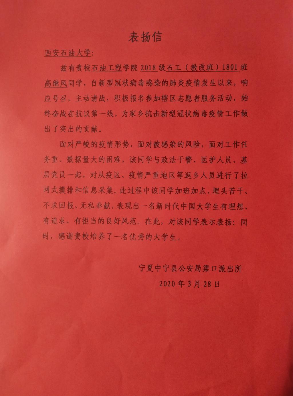 新冠肺炎疫情發(fā)生以來(lái),石油工程學(xué)院青年學(xué)子勇挑重?fù)?dān)、主動(dòng)出擊,參與到家鄉(xiāng)社區(qū)、鄉(xiāng)村的各項(xiàng)防控工作中。3月28日,學(xué)院2018級(jí)學(xué)生高繼鳳同學(xué),因在疫情防控工作中表現(xiàn)突出,受到了寧夏中寧縣公安局渠口派出所的表?yè)P(yáng)。