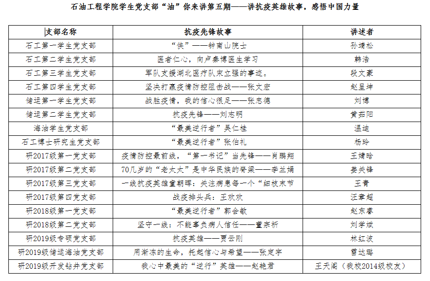 3月份以來(lái),為切實(shí)講好抗疫英雄故事,讓英雄的故事鼓舞人,在學(xué)生黨員中形成崇尚英雄、學(xué)習(xí)英雄的良好氛圍,石油工程學(xué)院學(xué)生黨支部接續(xù)開(kāi)展了第五期“油”你來(lái)講活動(dòng)。本期活動(dòng)以新冠肺炎疫情防控中的先鋒模范人物的英雄事跡為素材,講述抗疫英雄們的勇于擔(dān)當(dāng)、忠誠(chéng)盡責(zé)、甘于奉獻(xiàn)、執(zhí)著堅(jiān)守,弘揚(yáng)新時(shí)代英雄們的優(yōu)秀品格和精神,激勵(lì)大學(xué)生黨員從自身出發(fā),向英雄致敬,向先鋒看齊,加強(qiáng)為身邊群眾服務(wù)的意識(shí),增強(qiáng)為民、為國(guó)作貢獻(xiàn)的精神動(dòng)力。
