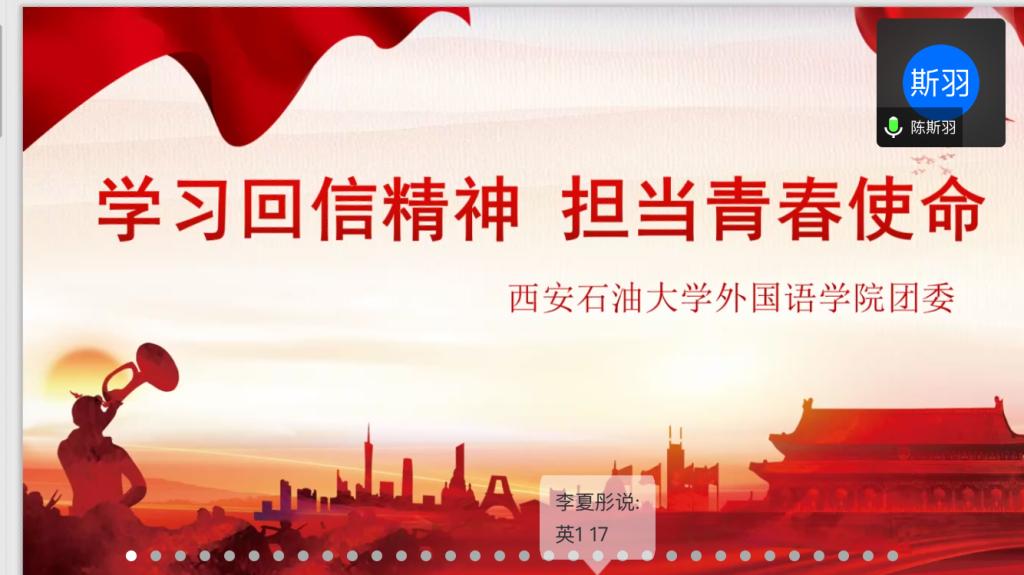 為認(rèn)真學(xué)習(xí)習(xí)近平總書記給在給首鋼醫(yī)院實(shí)習(xí)的西藏大學(xué)醫(yī)學(xué)院學(xué)生重要回信精神,按照學(xué)校團(tuán)委《關(guān)于開展“學(xué)習(xí)回信精神,擔(dān)當(dāng)青春使命”線上主題團(tuán)日活動(dòng)》要求,4月6日下午,外國語學(xué)院團(tuán)委通過騰訊會議線上開展了“云端”雙語主題團(tuán)日活動(dòng)。主題團(tuán)日活動(dòng)邀請學(xué)校團(tuán)委書記何國強(qiáng)參加,外國語學(xué)院團(tuán)委書記張帆以及學(xué)院150余名共青團(tuán)員共同學(xué)習(xí),活動(dòng)由翻譯1901班團(tuán)支書劉曉可主持。