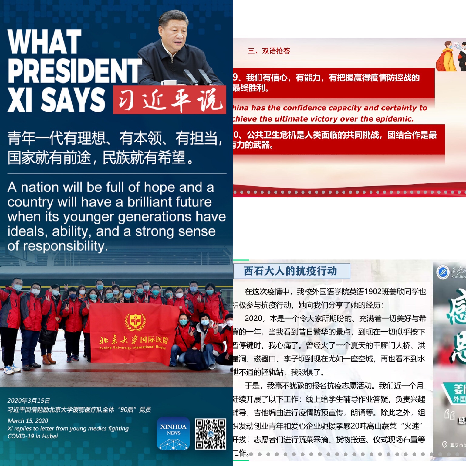 本次團(tuán)日活動(dòng)以“學(xué)習(xí)回信精神,擔(dān)當(dāng)青春使命---What can I do in the battle against the virus?”為主題,重點(diǎn)圍繞習(xí)近平總書記給在首鋼醫(yī)院實(shí)習(xí)的西藏大學(xué)醫(yī)學(xué)院學(xué)生的回信和給北京大學(xué)援鄂醫(yī)療隊(duì)全體“90后”黨員回信精神雙語版的學(xué)習(xí)、習(xí)近平總書記在抗擊疫情期間金句雙語學(xué)習(xí)以及雙語搶答環(huán)節(jié)三部分展開。