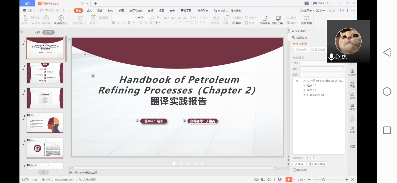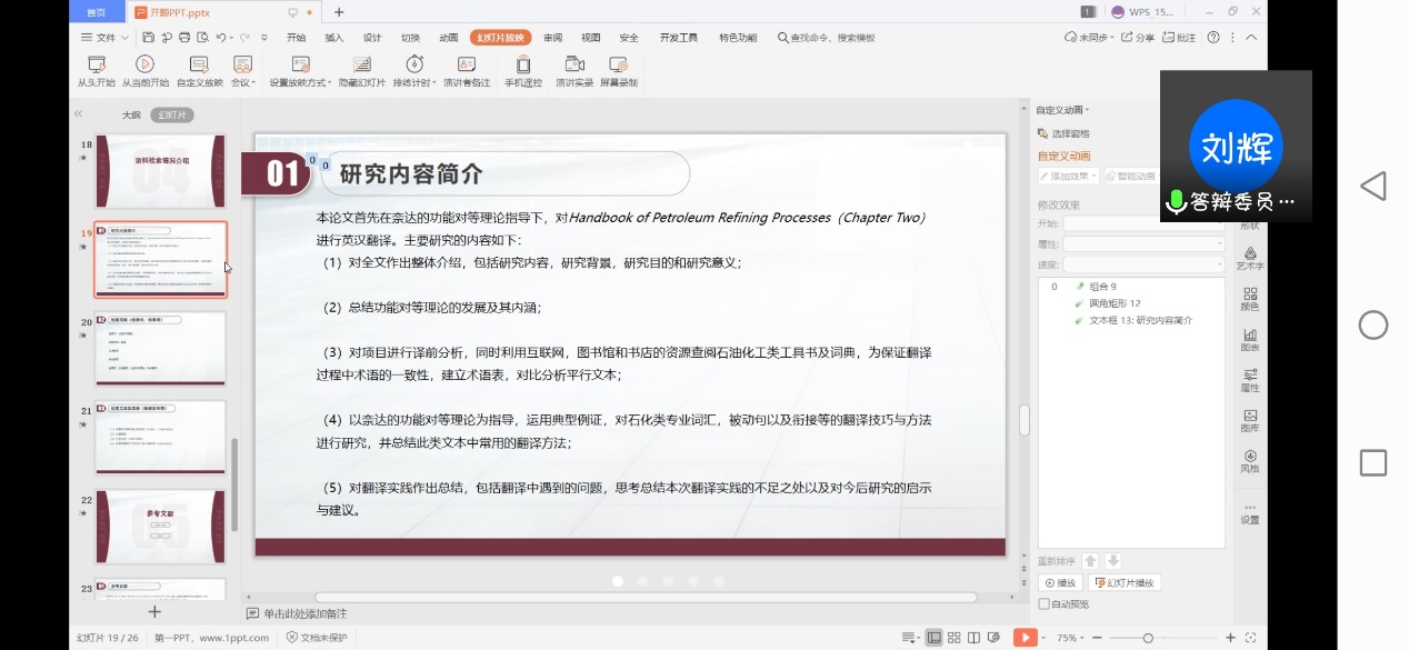 研究生學(xué)位論文開題是完成學(xué)位論文工作的基礎(chǔ),是保證學(xué)位論文質(zhì)量的重要環(huán)節(jié),為保證研究生培養(yǎng)質(zhì)量和研究生學(xué)位論文水平,外國語學(xué)院依據(jù)研究生院《碩士學(xué)位論文開題管理補(bǔ)充規(guī)定》制定了2018級翻譯碩士研究生二次開題工作細(xì)則,并于4月3日上午,使用線上平臺(騰訊會議)進(jìn)行了2018級翻譯碩士研究生二次開題答辯會。答辯小組包括組長袁森教授,答辯委員劉輝教授和秦艷霞副教授,共有9名翻譯碩士研究生參加答辯。