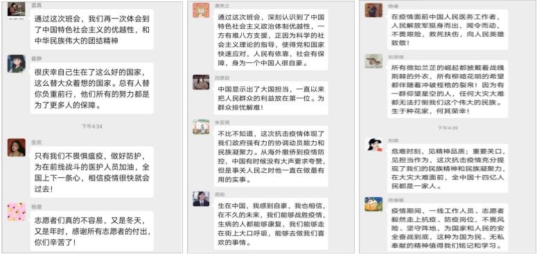 最后,趙劍波老師總結本次“云”班會,講解新冠肺炎疫情下體現(xiàn)出中國特色社會主義制度的優(yōu)越性。中國共產(chǎn)黨領導中華民族在社會主義制度下從戰(zhàn)亂中萌發(fā)壯大,具有中國特色的社會主義管理制度使得中國人民開始卓立潮頭,社會主義制度的巨大優(yōu)勢就是能夠集中力量辦大事,這在新中國成立70年、改革開放40年來的實踐和遭遇重大事件中反復得到印證,所以我們堅信我們的國家一定有能力取得疫情防控阻擊戰(zhàn)的最終勝利!