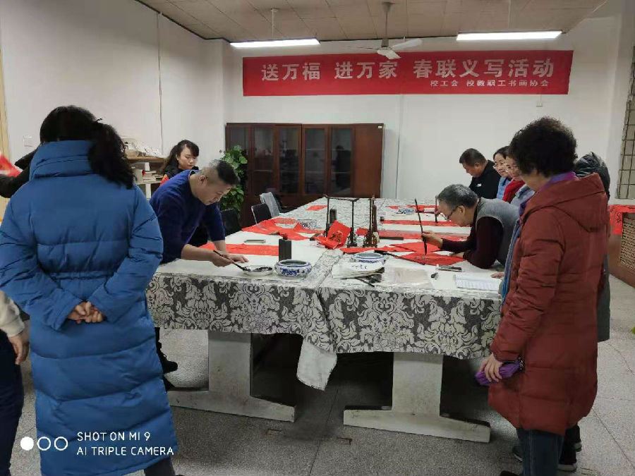 2020年元月9日,農歷庚子新年來臨之際,為深入學習宣傳貫徹習近平新時代中國特色社會主義思想和黨的十九大、十九屆二中、三中、四中全會精神,弘揚中華優(yōu)秀傳統(tǒng)文化,豐富廣大職工精神文化生活,營造歡樂祥和的節(jié)日氛圍,校工會、校教職工書畫協(xié)會按照省總工會工作部署,在雁塔校區(qū)圖書館四樓書畫活動室開展“送萬福、進萬家”書法公益活動。為廣大教職工義務書寫春聯(lián),把校工會對全校教職工的關懷和祝福送到每家每戶。