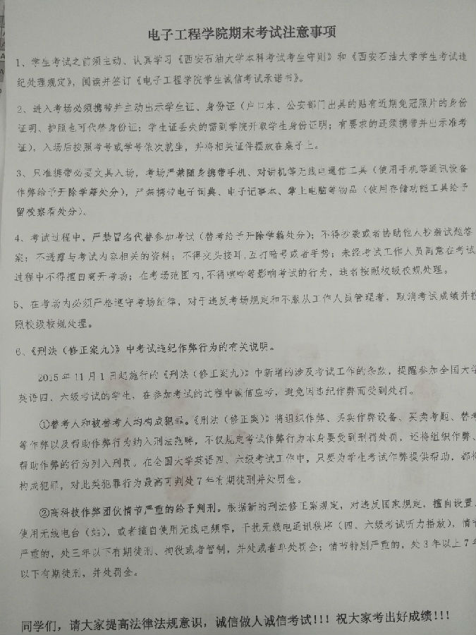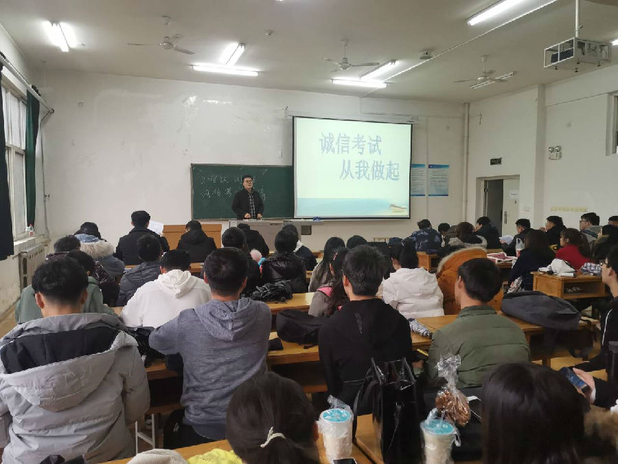 二是各年級結(jié)合實際情況,以專業(yè)為單位分別召開了誠實守信教育大會,輔導員老師結(jié)合PPT,帶領(lǐng)全體研究生同學學習了《西安石油大學研究生手冊》中《國家教育考試違規(guī)處理辦法》和《西安石油大學學生(研究生)考試違紀處理規(guī)定》,以及 2015年11月1日起施行的《刑法(修正案九)》中新增涉及考試工作的條款,提醒同學們在參加各類考試的過程中要嚴格做到誠信應(yīng)考,避免因違紀作弊而受到處罰。