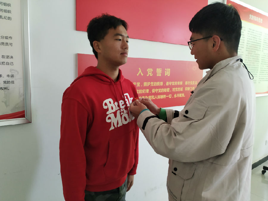 活動(dòng)上,2019年轉(zhuǎn)正的學(xué)生黨員們向2019年入黨的黨員們贈(zèng)送了《中國(guó)共產(chǎn)黨章程》,并為他們佩戴了黨徽,希望他們可以牢記黨員身份,提醒他們?cè)趯W(xué)習(xí)和生活中時(shí)刻以黨員的標(biāo)準(zhǔn)嚴(yán)格要求自己,切實(shí)發(fā)揮先鋒模范作用,為學(xué)院、班級(jí)和同學(xué)們做好服務(wù)。