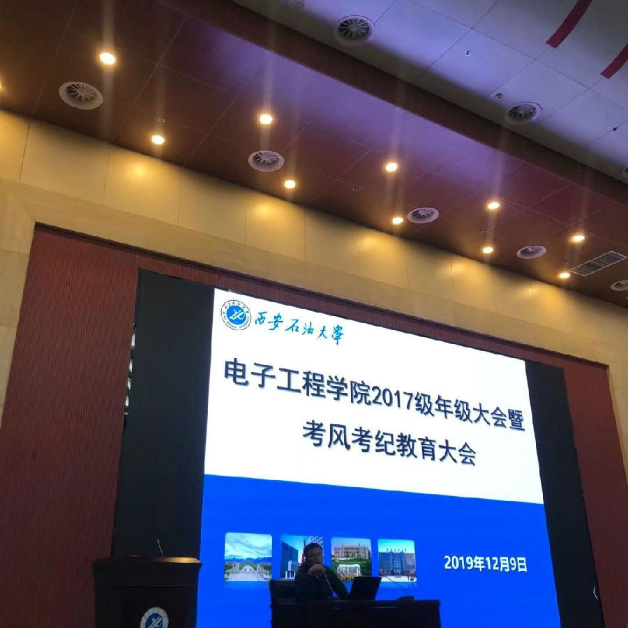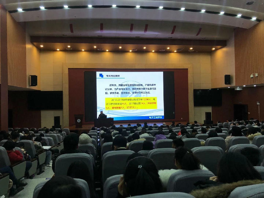 12月9日晚七點(diǎn),電子工程學(xué)院2017級(jí)年級(jí)大會(huì)暨考風(fēng)考紀(jì)教育大會(huì)在鄠邑校區(qū)弘石學(xué)術(shù)報(bào)告廳召開,會(huì)議由電子工程學(xué)院2017級(jí)輔導(dǎo)員高建邦老師主持,學(xué)院全體2017級(jí)學(xué)生參加了本次大會(huì)。大會(huì)內(nèi)容從學(xué)生現(xiàn)階段的學(xué)習(xí)和生活實(shí)際出發(fā), 主要從“身心健康教育”、“考風(fēng)考紀(jì)教育”、“安全教育”“獎(jiǎng)助學(xué)金工作匯報(bào)”“專業(yè)學(xué)習(xí)及畢業(yè)選擇”等內(nèi)容展開。