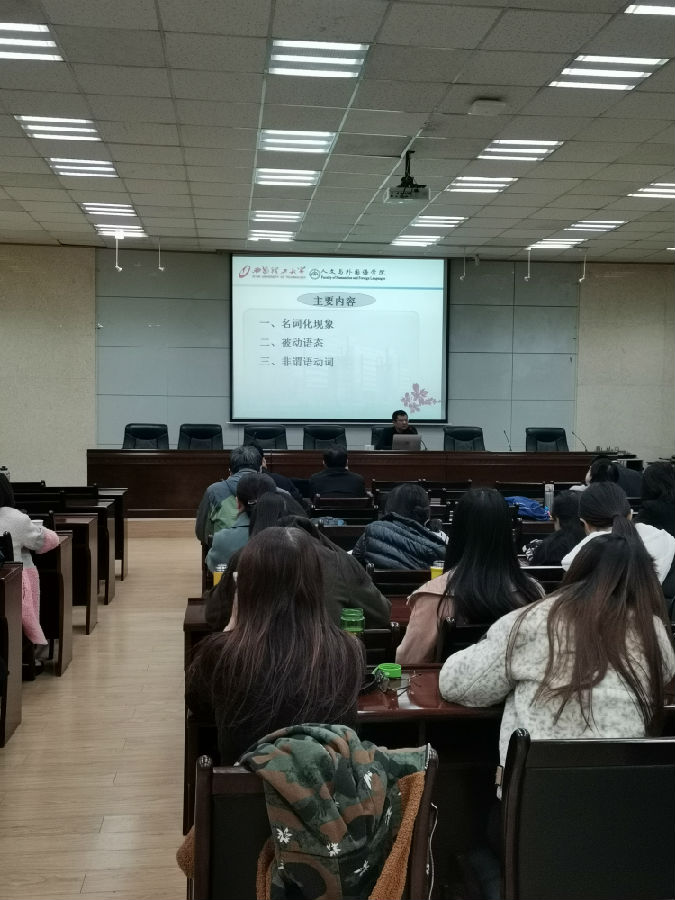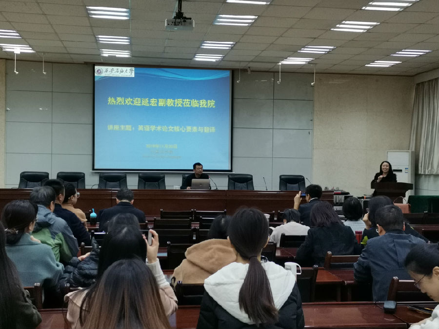 2019年11月20日下午15:00,在我校雁塔校區(qū)會議中心第三會議室,全國知名科技英語專家,西安理工大學科技英語翻譯研究所副所長延宏教授應邀做了題為《英語學術(shù)論文語言核心要素與翻譯》的學術(shù)報告。外國語學院教師和研究生參加了此次報告,報告由外國語學院副院長劉輝主持。