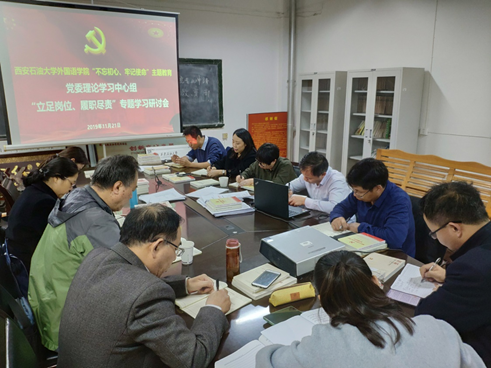 11月21日下午,外國(guó)語(yǔ)學(xué)院黨委理論學(xué)習(xí)中心組在雁塔校區(qū)1號(hào)教學(xué)主樓701會(huì)議室召開(kāi)“立足崗位、履職盡責(zé)”專題學(xué)習(xí)研討會(huì)。學(xué)院黨政領(lǐng)導(dǎo)班子、理論中心組成員、教工黨支部書記參加了會(huì)議,會(huì)議由學(xué)院黨委書記蔡強(qiáng)主持。