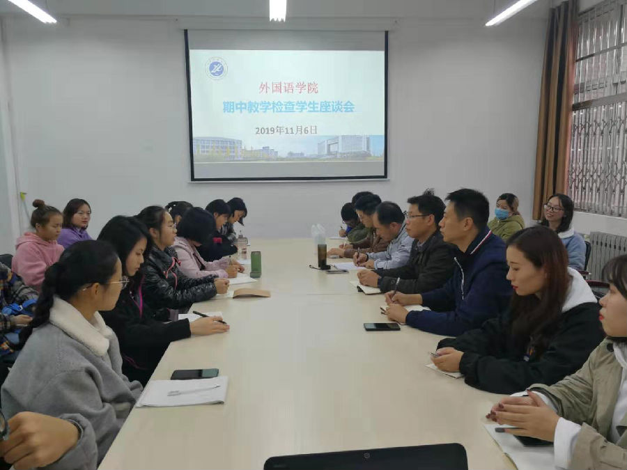 外國語學院于2019年11月6日下午在鄠邑校區(qū)人文經(jīng)管樓外國語學院314會議室舉行了期中教學檢查學生座談會。外國語學院黨委副主書記王業(yè)青主持召開了此次會議,學院教學院長陳武,英語系主任鐘澤波、翻譯系副主任秦艷霞、俄語系副主任李更偉,教學秘書張露小荷及外國語學院各班學生代表參加了此次座談會。