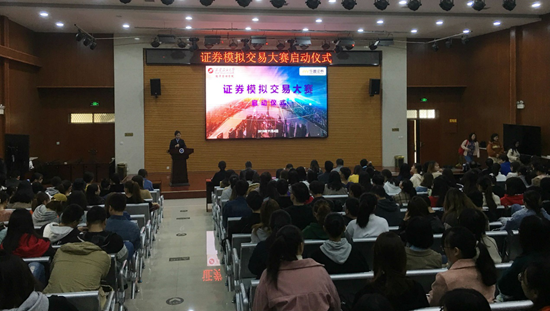吳勛副院長在致辭中結(jié)合教育部召開的新時代全國高等學(xué)校本科教育工作會議的精神指出,全面提高高等教育質(zhì)量,本科教育至關(guān)重要,本次大賽的啟動就是要給我院大學(xué)生合理“增負(fù)”,這不僅有助于同學(xué)們做到知行合一,將理論知識轉(zhuǎn)化為實(shí)踐能力,也有助于我院的專業(yè)建設(shè)和學(xué)科發(fā)展。王天福副總經(jīng)理在講話中指出,本次大賽旨在為擬參與證券投資的同學(xué)搭建一個模擬證券交易的平臺和環(huán)境,進(jìn)行專業(yè)知識教育和模擬交易,幫助同學(xué)們盡快熟悉證券交易規(guī)則,為后續(xù)的學(xué)習(xí)和工作打下良好基礎(chǔ)。趙海濤副書記宣布證券模擬交易大賽正式啟動。