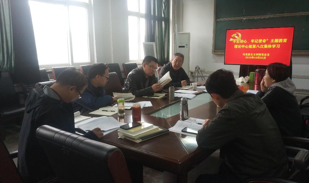2019年10月25日上午,馬克思主義學(xué)院黨總支理論學(xué)習(xí)中心組舉行 “不忘初心、牢記使命”主題教育第八次集體學(xué)習(xí)暨“奮進(jìn)有位抓落實(shí)”專題研討。學(xué)習(xí)研討會(huì)議由黨總支書(shū)記李淵主持,學(xué)院黨政領(lǐng)導(dǎo)班子、理論中心組成員、教工黨支部書(shū)記及教研室主任參加。