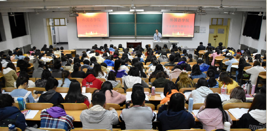10月24日晚,外國語學院專業(yè)教育專題報告會在鄠邑校區(qū)A134教室召開,報告會由副院長陳武、英語系主任鐘澤波、俄語系主任李娜和翻譯系主任高鵬鵬主講。學管辦主任張帆主持了報告會,2018級、2019級300余名學生參加了專題報告會。