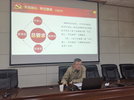 閆書(shū)記首先對(duì)“不忘初心、牢記使命”主題教育做了簡(jiǎn)介。他指出,“不忘初心、牢記使命”主題教育是在全黨范圍內(nèi)開(kāi)展的主題教育,是推動(dòng)全黨更加自覺(jué)地為實(shí)現(xiàn)新時(shí)代黨的歷史使命不懈奮斗的重要內(nèi)容。2019年5月13日, 中共中央政治局召開(kāi)會(huì)議,決定從2019年6月開(kāi)始,在全黨自上而下分兩批開(kāi)展“不忘初心、牢記使命”主題教育。9月,《關(guān)于開(kāi)展第二批“不忘初心、牢記使命”主題教育的指導(dǎo)意見(jiàn)》印發(fā)。本次主題教育的總要求為守初心、擔(dān)使命,找差距、抓落實(shí),根本任務(wù)是牢牢把握深入學(xué)習(xí)貫徹習(xí)近平新時(shí)代中國(guó)特色社會(huì)主義思想、錘煉忠誠(chéng)干凈擔(dān)當(dāng)?shù)恼纹犯?、團(tuán)結(jié)帶領(lǐng)全國(guó)各族人民為實(shí)現(xiàn)偉大夢(mèng)想共同奮斗,具體目標(biāo)包括理論學(xué)習(xí)有收獲,思想政治受洗禮,干事創(chuàng)業(yè)敢擔(dān)當(dāng),為民服務(wù)解難題,清正廉潔作表率。