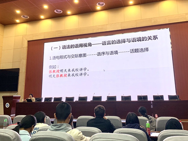 在指出目前二語習(xí)得視閾學(xué)術(shù)研究存在先天不足(這是由于受限于漢語是研究者母語的習(xí)得心理與機(jī)制等客觀條件)的現(xiàn)狀,并強(qiáng)調(diào)外語在二語習(xí)得領(lǐng)域相關(guān)對比分析理論研究的重要性后,黃冬麗老師詳細(xì)闡述并釋例介紹了量詞以及語法的相關(guān)知識,并在與同學(xué)們的問答互動中引出偏誤的存在情況、分布狀況及產(chǎn)生原因。