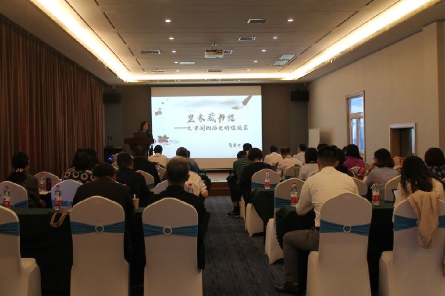 本次會議特別邀請承德避暑山莊博物館館長蔣秀丹作了題為“皇家藏書樓——文津閣的歷史價值探索”的報告,報告中主要介紹了四庫全書七所藏書樓之一的文津閣的歷史情況和藏書保存情況以及文津閣藏書的歷史價值。