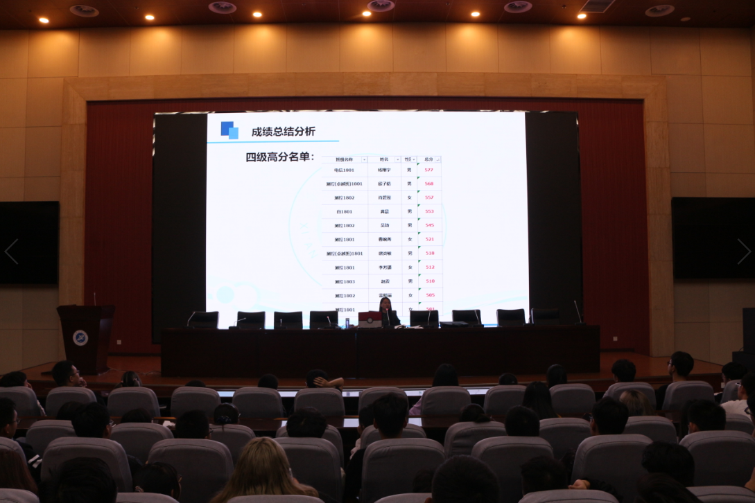 錢(qián)宇航老師對(duì)本年級(jí)學(xué)生上一學(xué)期的期末成績(jī)做出了分析,通報(bào)了本年級(jí)英語(yǔ)四、六級(jí)考試通過(guò)率,表?yè)P(yáng)了通過(guò)英語(yǔ)六級(jí)考試以及英語(yǔ)四級(jí)考試成績(jī)超過(guò)五百分的學(xué)生,她勉勵(lì)在座的各位學(xué)生以?xún)?yōu)秀為榜樣,規(guī)劃人生,樹(shù)立理想,腳踏實(shí)地,勤奮學(xué)習(xí),希望以此在同學(xué)中形成“比、超、趕、追”的良好學(xué)習(xí)氛圍。