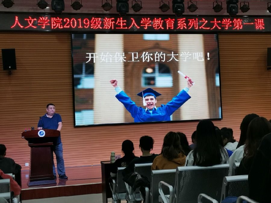 為使學(xué)生適應(yīng)新環(huán)境,提高對大學(xué)生活的認(rèn)識,人文學(xué)院于9月26日晚組織2019級全體新生在人文經(jīng)管樓118多功能報告廳開展了新生入學(xué)教育會——大學(xué)第一課,本次會議邀請了就業(yè)指導(dǎo)中心副主任樊曉旭老師為大一新生做精彩分享,人文學(xué)院黨委副書記盛丹、新生輔導(dǎo)員張澤正出席了會議。