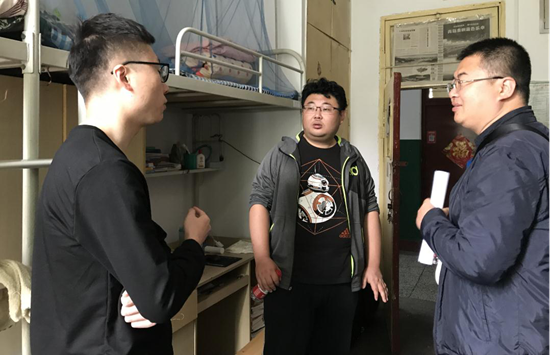 走進(jìn)研究生宿舍,趙海濤副書記詳細(xì)詢問了同學(xué)們的科研學(xué)習(xí)情況、宿舍搬遷后生活環(huán)境的適應(yīng)情況以及2017級研究生的就業(yè)情況。在與學(xué)生的交談中,老師們還提醒研究生要增強(qiáng)安全防范意識,確保人身財物安全,并囑咐大家要注意注意作息規(guī)律,鍛煉身體,嚴(yán)格要求自己,以積極的心態(tài)和良好的面貌面對校園生活。談話在歡聲笑語中進(jìn)行,氣氛十分融洽,一聲聲關(guān)心與問候,讓同學(xué)們倍感親切。
