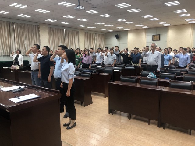 在廖敏書記的帶領(lǐng)下下,全體教師面朝國旗莊嚴(yán)宣誓,“我志愿成為一名光榮的人民教師,忠誠黨的教育事業(yè),貫徹黨的教育方針,履行教師的神圣職責(zé)......”。