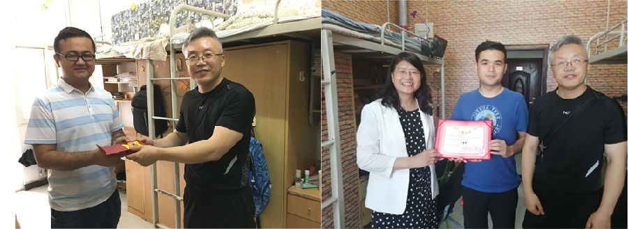 學(xué)院領(lǐng)導(dǎo)老師一行先后走訪了學(xué)院化工、能化、應(yīng)化、環(huán)境等各專業(yè)宿舍,受到了畢業(yè)生的熱情歡迎,大家就畢業(yè)生在校近況、離校安排、就業(yè)去向及今后打算等進(jìn)行了現(xiàn)場(chǎng)交流。聽聞化工專業(yè)阿迪力·吾買爾主動(dòng)投身西部計(jì)劃,將赴南疆和田一線就業(yè),應(yīng)化專業(yè)楊佳暉志愿參軍選擇畢業(yè)入伍,司馬書記對(duì)他們積極響應(yīng)國(guó)家號(hào)召,志愿投身國(guó)防、扎根邊疆給予高度評(píng)價(jià),并送上了刻有專屬姓名的原油印章畢業(yè)禮物,希望他們能扎根基層,積極進(jìn)取,為服務(wù)祖國(guó)、服務(wù)地方做出自己應(yīng)有的貢獻(xiàn)。環(huán)境專業(yè)依布拉音同學(xué)在校期間積極參加各項(xiàng)民族團(tuán)結(jié)教育活動(dòng),并在學(xué)院《祖國(guó)頌》慶祝建國(guó)70周年經(jīng)典朗誦比賽榮獲一等獎(jiǎng),司馬書記和王院長(zhǎng)現(xiàn)場(chǎng)為他頒發(fā)了獲獎(jiǎng)證書,鼓勵(lì)他在走上工作崗位后,繼續(xù)傳承發(fā)揚(yáng)石油精神和鐵人精神,再創(chuàng)佳績(jī),回報(bào)母校。