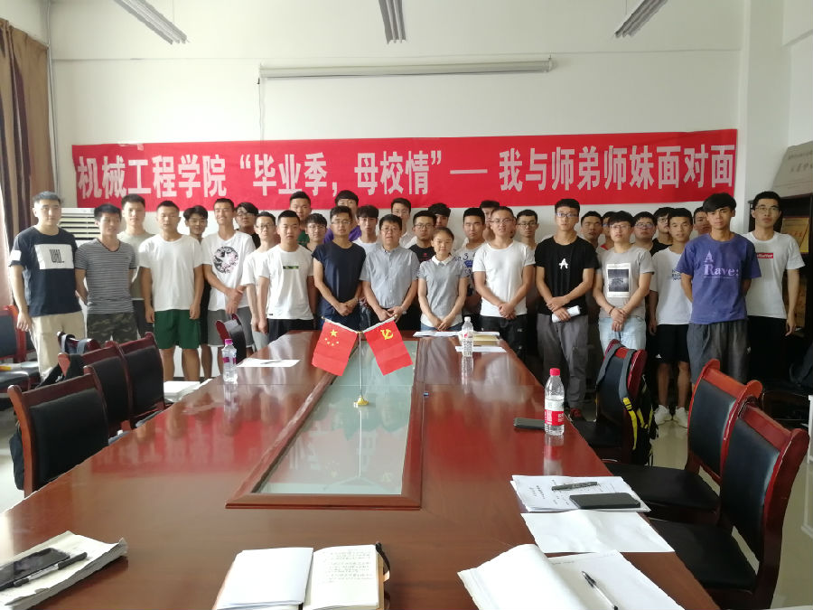 6月25日中午,機械工程學(xué)院“畢業(yè)季,母校情”系列活動“我與師弟師妹面對面”活動在鄠邑校區(qū)機械材料樓431室舉行,學(xué)院團委書記、學(xué)管辦主任文愛國,2015級輔導(dǎo)員歐紅娟,2019屆優(yōu)秀畢業(yè)生及低年級學(xué)生代表總計40余人參加,會議由2017級輔導(dǎo)員馬武軍主持。