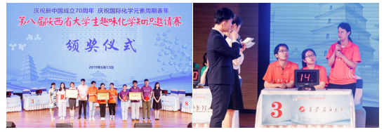 為深入學(xué)習(xí)宣傳貫徹黨的十九大精神,迎接新中國(guó)70周年華誕、慶祝國(guó)際化學(xué)元素周期表發(fā)現(xiàn)150周年,激發(fā)大學(xué)生崇尚科學(xué)的精神,營(yíng)造濃厚的學(xué)習(xí)氛圍,進(jìn)一步建設(shè)校園創(chuàng)新創(chuàng)業(yè)文化,6月13日晚,我?;瘜W(xué)化工學(xué)院與西北工業(yè)大學(xué)、西北大學(xué)、陜西師范大學(xué)、陜西科技大學(xué)、西安理工大學(xué)、榆林學(xué)院、西安科技大學(xué)、西安建筑科技大學(xué)等8個(gè)高校代表隊(duì)?wèi)?yīng)邀在西北大學(xué)長(zhǎng)安校區(qū)參加了第八屆陜西省大學(xué)生趣味化學(xué)知識(shí)邀請(qǐng)賽。本次比賽由陜西省化學(xué)會(huì)、西北大學(xué)主辦,西北大學(xué)化學(xué)與材料科學(xué)學(xué)院承辦。