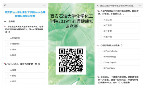為豐富大學生校園文化活動,普及大學生心理健康知識,促進大學生全面協調發(fā)展,擁有健全的人格和幸福的體驗,5月5日-5月8日,學院各年級、班級積極組織學生共計1500人參加了在線心理健康知識競賽。同學們紛紛表示,在此次的活動中收獲頗豐,以后會以更加積極的心態(tài)去面對生活中所遇到的挫折與挑戰(zhàn)。