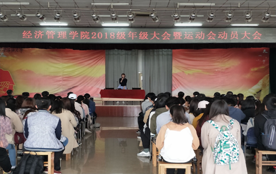 2019年4月16日中午,經(jīng)濟管理學(xué)院2018級年級大會暨運動會動員大會在騰輝大學(xué)生活動中心召開。院黨委副書記趙海濤老師,2018級輔導(dǎo)員尹曉嬌老師、陸曉寒老師及2018級全體同學(xué)參加本次大會。