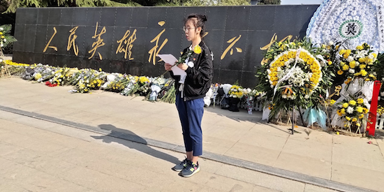 會計1603班歐陽榕襄作為代表致悼詞。她說到,矗立在大家面前的烈士豐碑,訴說著英雄們光榮而無悔的事業(yè),歲月的風塵早已在它身上刻下斑駁的印記,讓大家無法不回想起那段滄桑沉重的往事。七百余位革命烈士長眠于此。他們?yōu)樽非缶葒让竦恼胬頀侇^顱,灑熱血;為中華民族的解放事業(yè)前仆后繼,視死如歸。作為新時代的莘莘學子,更應充滿愛國之情,樹立報國之心,努力學習,繼承先烈遺志,為家鄉(xiāng)的建設、為祖國的富強而努力奮斗。