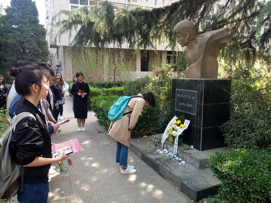 離開烈士陵園后,大家步行至我校雁塔校區(qū),在烈士唐春雨的雕像前,行鞠躬禮,以表達崇敬和懷念之情。