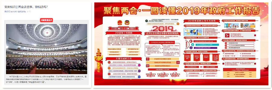 積極關(guān)注“兩會(huì)”動(dòng)態(tài),加強(qiáng)“兩會(huì)”知識(shí)宣傳。學(xué)院依托“西油計(jì)”微信公眾號(hào)、微信群、QQ群和展板等多種平臺(tái),集中開(kāi)展“‘兩會(huì)’那些事兒”、“一圖看懂2019年政府工作報(bào)告”等知識(shí)點(diǎn)宣傳,實(shí)現(xiàn)宣傳進(jìn)教研室、進(jìn)年級(jí)、進(jìn)支部、進(jìn)班級(jí)、進(jìn)宿舍。