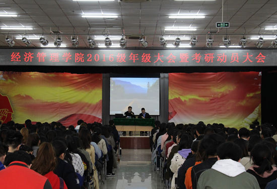 3月13日下午,經(jīng)濟管理學院2016級年級大會暨考研動員大會在鄠邑校區(qū)騰輝大學生活動中心召開??佳休o導專家王思陽老師、李茸老師出席,輔導員武威老師、孫劍秋老師與2016級600余名學生參加。