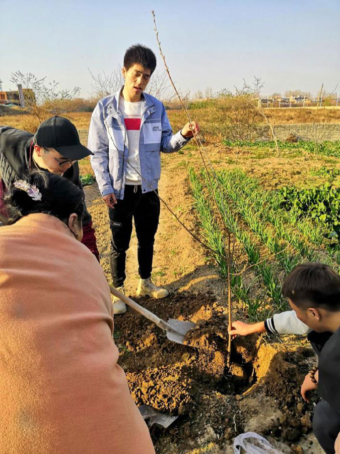 活動中,大家積極勞動,相互協(xié)作。各位黨員同志表現(xiàn)出了極高的活動熱情,向當(dāng)?shù)卮迕裾埥剔r(nóng)作物常識及植樹相關(guān)知識。村民們知無不答、答無不詳,頗為熱心地指導(dǎo)大家種樹間距、挖坑技巧,幫助同學(xué)們埋土澆水?!按龟幃?dāng)覆地,聳干會參天。好作思人樹,漸作惠化傳?!蓖瑢W(xué)們化身“綠色使者”,為剛剛蘇醒的鄉(xiāng)村送去了生機,為剛剛解凍的自然帶來了溫暖。在張陽老師的帶領(lǐng)下,大家相互幫助,團結(jié)協(xié)作,有條不紊地進行工作。在此春暖花開的季節(jié),種下一棵棵樹苗,留下一片片綠色,收獲一個個希望。同學(xué)們的認真負責(zé)、朝氣蓬勃得到了村民們的一致認可和充分肯定。