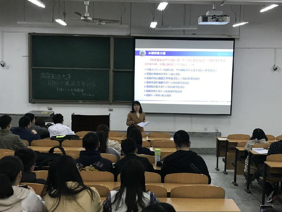 3月11日晚19:00,國際交流與合作處在鄠邑校區(qū)B114教室舉辦留學(xué)項(xiàng)目宣講會,王文化副處長主講。