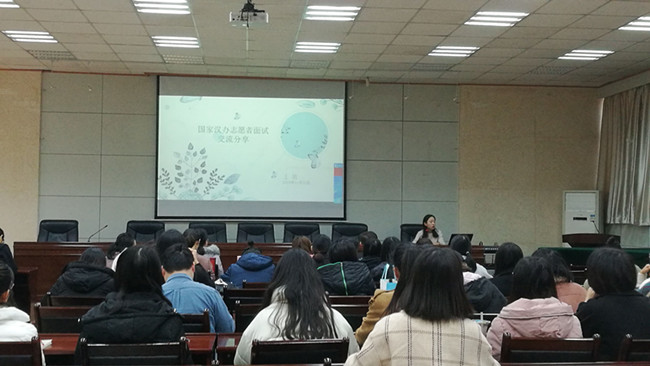 王敏在題為《國家漢辦志愿者面試交流分享》的報(bào)告中從心理測試、綜合面試、英語面試等三個方面出發(fā),結(jié)合自身的海外教學(xué)經(jīng)驗(yàn),講述了漢辦面試的經(jīng)歷及志愿者精神的內(nèi)涵。于明嬌在題為《漢辦志愿者面試》的報(bào)告中從面試環(huán)節(jié)、崗前培訓(xùn)、面試真題及出國建議等四個方面,對國家漢辦志愿者的面試情況進(jìn)行了具體的講解與分析。