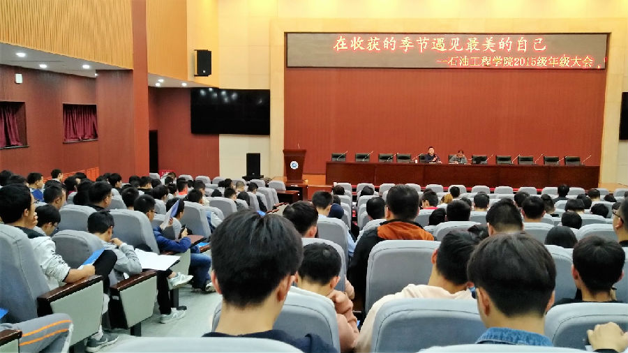 9月25日晚7點(diǎn),石油工程學(xué)院2015級在新校區(qū)弘石報告廳召開了以“在收獲的季節(jié)遇見最美的自己”為主題的年級大會。參加本次會議的有石油工程學(xué)院學(xué)生管理辦公室主任孫會珠老師,2015級輔導(dǎo)員朱戰(zhàn)威老師以及2015級全體同學(xué)。