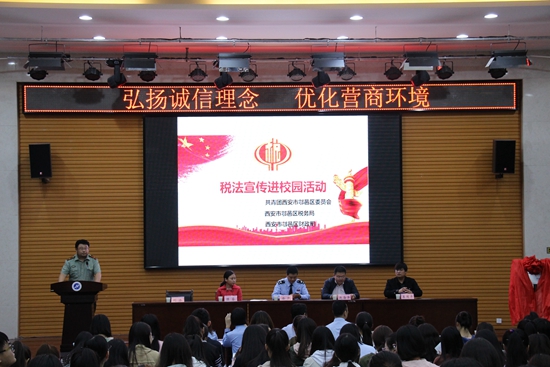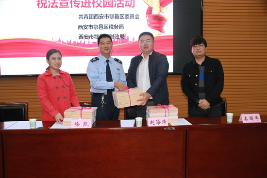 區(qū)稅務(wù)局總經(jīng)濟(jì)師徐凱介紹由西安市團(tuán)委、稅務(wù)局、財(cái)政局聯(lián)合發(fā)起的稅收宣傳進(jìn)校園的活動(dòng)概括,并宣傳從早抓起,在學(xué)生中倡導(dǎo)懂法、知法、守法、學(xué)法,鼓勵(lì)學(xué)生爭(zhēng)做稅收宣傳員。