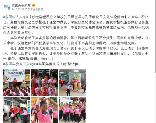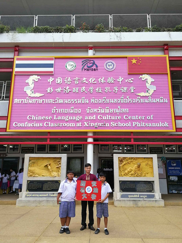 近日,人文學(xué)院漢語國際教育專業(yè)17級研究生在泰國醒民學(xué)??鬃诱n堂舉辦了孔子學(xué)院日活動。這是由并國家漢辦、孔子學(xué)院發(fā)起,世界各地孔院同時舉辦,為紀(jì)念孔子學(xué)院建設(shè)發(fā)展的重要慶?;顒?,其目的是宣揚(yáng)中華文化,推廣漢語教育。此次活動被泰國華人頭條網(wǎng)報道,受到了當(dāng)?shù)匦nI(lǐng)導(dǎo)和學(xué)生們的一致認(rèn)可和高度評價。