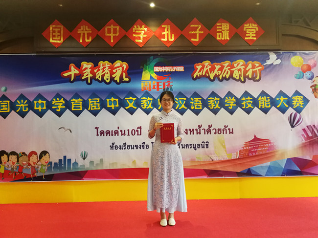 2018年9月10正值中國的教師節(jié),泰國國光中學孔子課堂舉辦了特殊的慶祝活動“國光中學首屆中文教師漢語教學技能大賽”,希望在這個特殊的日子里讓老師能夠以賽促教,以賽促學,能夠更好的發(fā)展對外漢語教學。我校漢語國際教育專業(yè)17級在讀碩士、漢語國際教師志愿者黨杏丹同學在此次活動中榮獲三等獎。