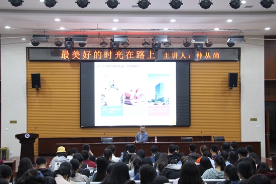 仲?gòu)纳邢壬v述了許多分量滿滿的干貨,他說(shuō)在大學(xué)中首先要學(xué)會(huì)的就是要獨(dú)立生活和處理事情,走出自己的平凡之路。學(xué)會(huì)合理安排自己的生活和學(xué)習(xí),不能忽視學(xué)習(xí)的重要性,學(xué)習(xí)是一種習(xí)慣,無(wú)關(guān)年齡。可以懶惰,但請(qǐng)不要一事無(wú)成。對(duì)于社團(tuán),他認(rèn)為社團(tuán)活動(dòng)有助于性格塑造,是打開(kāi)人脈關(guān)系的一把鑰匙。他鼓勵(lì)同學(xué)們“多戶外,少室內(nèi)”,多去領(lǐng)略大好河山,不要宅在家里、宅在宿舍。關(guān)于宿舍關(guān)系,他說(shuō)在最美好的時(shí)光遇見(jiàn)你,當(dāng)然是要做一輩子的好朋友!至于同學(xué)們四年后的發(fā)展,仲?gòu)纳邢壬o出了自己誠(chéng)懇的建議,為我們解決了不少疑惑。