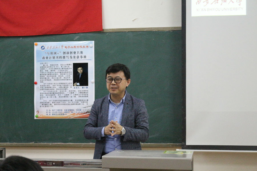 3月8日晚19點(diǎn),電子工程學(xué)院在鄠邑校區(qū)C3實(shí)驗(yàn)樓419教室成功舉辦了題為《商業(yè)計(jì)劃書的撰寫及注意事項(xiàng)》的專題講座。此次講座邀請到高級經(jīng)濟(jì)師、山水智慧企業(yè)管理咨詢有限公司CEO董小泰老師擔(dān)任主講。電子工程學(xué)院黨委副書記黃建禮、2016級輔導(dǎo)員梁琦、青年教師顏謹(jǐn)?shù)戎笇?dǎo)老師以及申報(bào)“互聯(lián)網(wǎng)+”創(chuàng)新創(chuàng)業(yè)項(xiàng)目的同學(xué)參加此次專題講座。