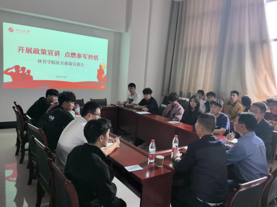 為積極響應(yīng)國家號召,增強(qiáng)學(xué)生國防意識,激發(fā)學(xué)生愛國熱情,4月16日下午,體育學(xué)院在鄠邑校區(qū)新操場208會議室舉辦以“開展政策宣講,點燃參軍熱情”為主題的征兵政策宣講會。會議邀請學(xué)校保衛(wèi)部(處)、武裝部副部(處)長袁坤主講,學(xué)院各年級有應(yīng)征入伍意愿的學(xué)生近20人參加,會議由學(xué)院黨總支書記茍毅飛主持。