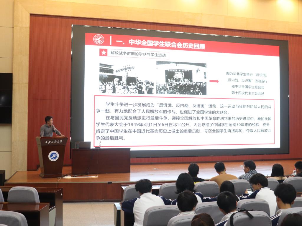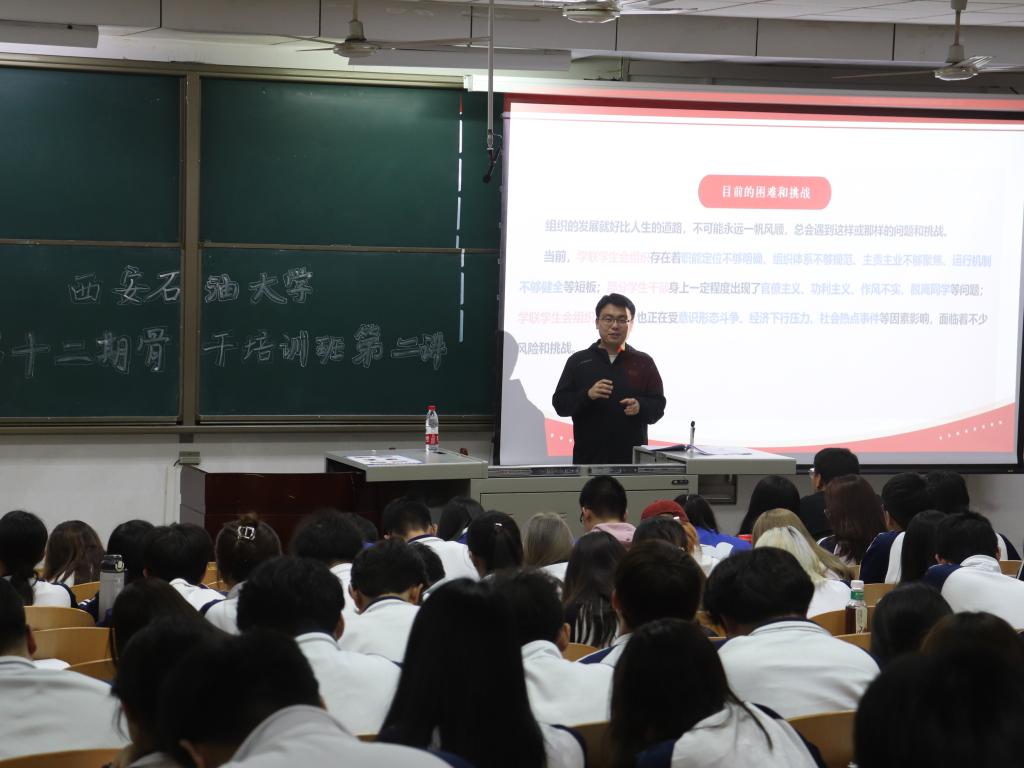 4月10日晚,省學(xué)聯(lián)主席、西北工業(yè)大學(xué)研究生會執(zhí)行主席白怡暄在弘石報(bào)告廳,以《以“青春之力”守正創(chuàng)新,堅(jiān)定書寫學(xué)生干部趕考新答卷》為題,從學(xué)聯(lián)歷史回顧、黨和國家對青年和學(xué)聯(lián)學(xué)生會組織的要求、新時(shí)代學(xué)聯(lián)學(xué)生會組織如何做到“全心全意服務(wù)同學(xué)”等方面進(jìn)行了詳細(xì)的講解,并結(jié)合自身學(xué)習(xí)與工作經(jīng)歷,勉勵廣大學(xué)生干部積極圍繞思想引領(lǐng)、學(xué)業(yè)發(fā)展、身心健康、社會融入、權(quán)益服務(wù)和校園文化等方面開展工作,團(tuán)結(jié)凝聚廣大石油學(xué)子積極投身社會主義現(xiàn)代化建設(shè)的火熱實(shí)踐。