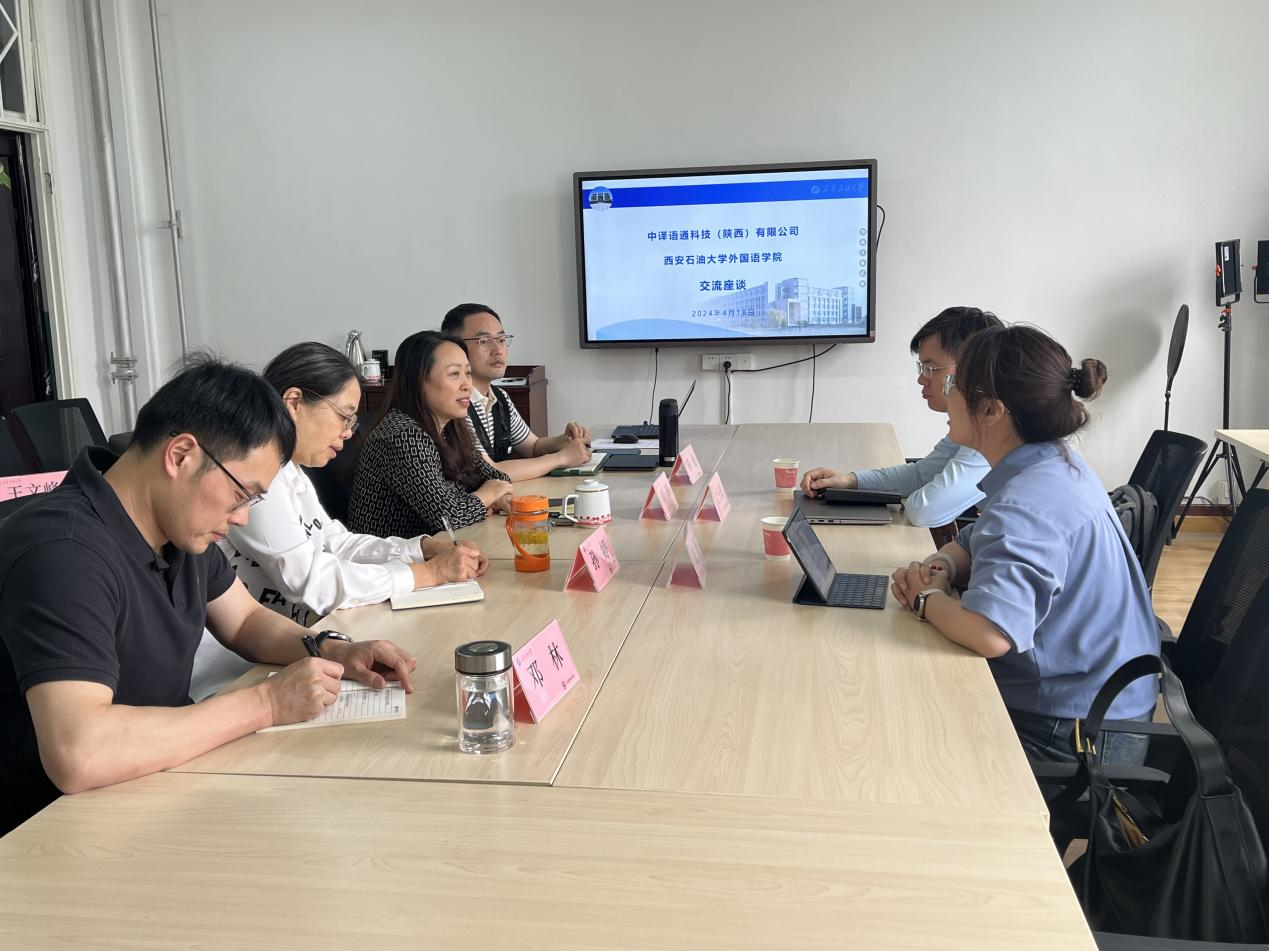 4月18日下午,中譯語通科技(陜西)有限公司語言服務(wù)事業(yè)群總監(jiān)陳棟、數(shù)據(jù)運(yùn)營(yíng)部總監(jiān)吉子瓏一行到訪外國(guó)語學(xué)院,主要圍繞區(qū)域國(guó)別研究進(jìn)行了合作交流研討。會(huì)議由外國(guó)語學(xué)院副院長(zhǎng)劉輝主持,俄語專業(yè)負(fù)責(zé)人孫婷、多語種部副主任陳旭、英語系副主任鄧林參加了交流研討。