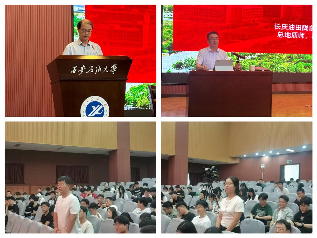 雷啟鴻校友本科學(xué)業(yè)和碩士研究生學(xué)業(yè)均在我校完成,是長(zhǎng)慶油田隴東油氣開發(fā)分公司常務(wù)副經(jīng)理、總地質(zhì)師、教授級(jí)高工、甘肅省領(lǐng)軍人才。報(bào)告會(huì)上,雷啟鴻校友從世界石油工業(yè)的發(fā)展談起,他說(shuō)到,自工業(yè)革命以來(lái),石油的用途從照明逐漸演變?yōu)槿剂?,現(xiàn)如今已廣泛應(yīng)用于各個(gè)領(lǐng)域,作為現(xiàn)代工業(yè)的血液,石油具有舉足輕重的戰(zhàn)略地位。在全球化日益加深的今天,各國(guó)石油產(chǎn)量需求更加旺盛,面對(duì)新形勢(shì)新挑戰(zhàn),加快構(gòu)建現(xiàn)代能源體系,必須堅(jiān)持以習(xí)近平新時(shí)代中國(guó)特色社會(huì)主義思想為指導(dǎo),深入貫徹落實(shí)“四個(gè)革命、一個(gè)合作”能源安全新戰(zhàn)略,將油氣行業(yè)和新能源行業(yè)發(fā)展結(jié)合,提升國(guó)際競(jìng)爭(zhēng)力,推動(dòng)能源生產(chǎn)和消費(fèi)結(jié)構(gòu)不斷優(yōu)化。隨后,雷啟鴻校友結(jié)合自己從業(yè)24年的工作經(jīng)歷,向研究生們提出幾點(diǎn)希望:一是胸懷理想,努力作為;二是德才兼?zhèn)洌π逓?;三是保持學(xué)習(xí),勤于思考;四是守正創(chuàng)新,注重合作。最后,他用習(xí)近平總書記在黨的二十大報(bào)告中的講話寄語(yǔ)廣大研究生“當(dāng)代中國(guó)青年生逢其時(shí),施展才干的舞臺(tái)無(wú)比廣闊,實(shí)現(xiàn)夢(mèng)想的前景無(wú)比光明。”他希望研究生們能將個(gè)人追求同國(guó)家需要和人民利益保持一致,成就更有意義的精彩人生。