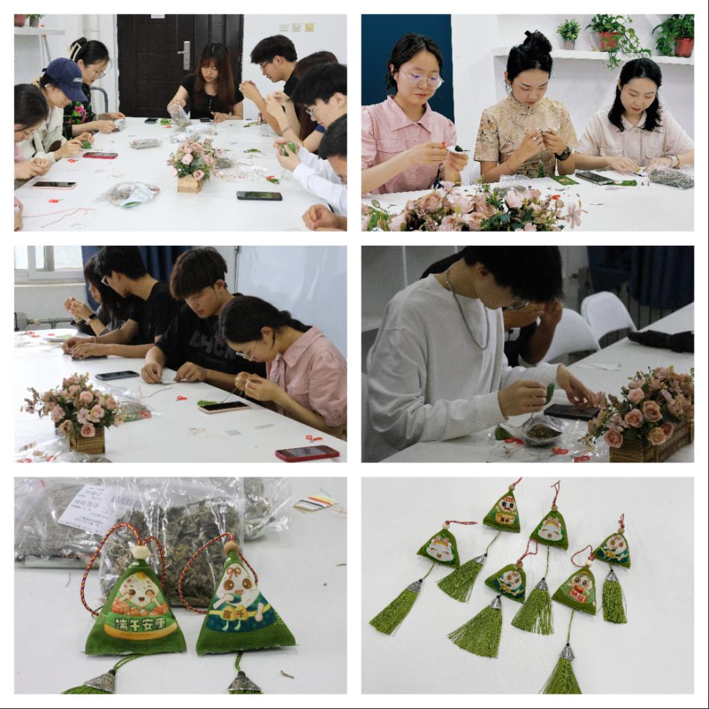 工作人員為大家介紹了端午節(jié)的由來以及習(xí)俗,耐心講解了制作香囊的傳統(tǒng)及方法。參與師生充分發(fā)揮動手能力,用艾草、中藥香料、麻布、五彩紗線以及各種配件,有條不紊地按照步驟親手縫制香囊。從穿針引線到填充香料再到釘穗收尾,大家互相分享著制作香囊的經(jīng)驗,一針一線,一個個獨一無二、精致飽滿的香囊呈現(xiàn)在眼前。在沉浸式體驗香囊制作的過程中,同學(xué)們不僅收獲了傳統(tǒng)手工藝的樂趣,傳承了香包制作的傳統(tǒng)習(xí)俗,更感悟到中華傳統(tǒng)文化的魅力。