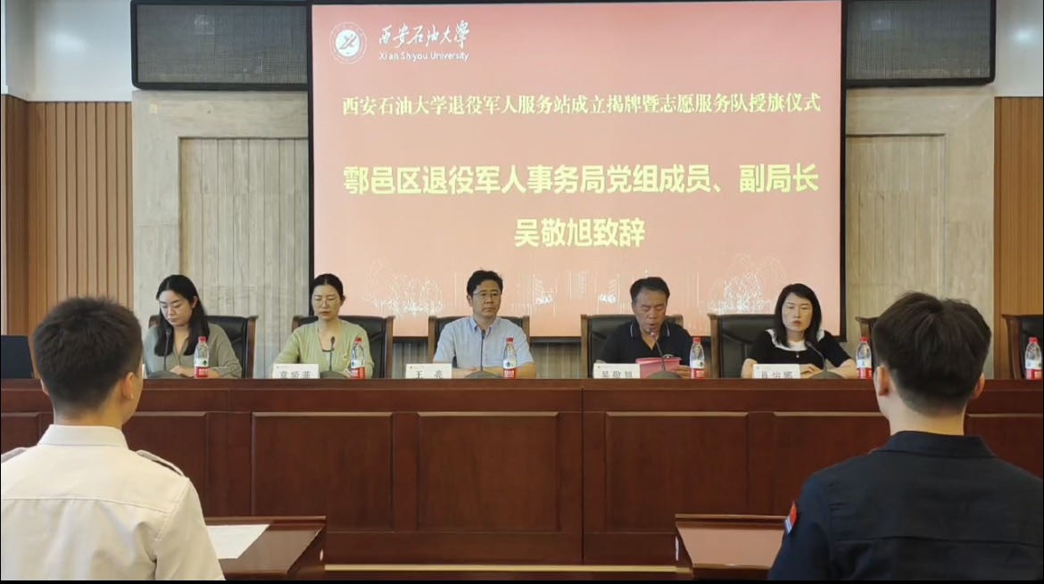 為做好退役大學生士兵服務保障工作,進一步拓展其服務領域,持續(xù)提升退役大學生士兵獲得感、幸福感、榮譽感,西安石油大學于7月4日下午在圖書館第一會議室隆重舉行退役軍人服務站成立揭牌暨志愿服務隊授旗儀式。鄠邑區(qū)退役軍人事務局黨組成員、副局長吳敬旭、西安石油大學學生工作部(武裝部)部長王亮、機械工程學院副院長章婭菲、相關部門工作人員及退役大學生士兵代表共40余人參加,機械工程學院學工辦主任王璟主持。